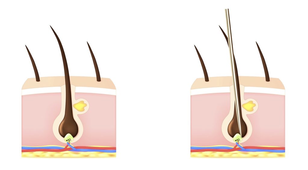 During the treatment, a very slender probe is gently inserted into the follicle. Because the follicle is a natural inward extension of the skin’s surface, the probe does not pierce the skin. A small current is applied, creating thermal and/or chemical changes that destroy the lower portion of follicle. The hair is then removed with tweezers, and we go on to the next follicle. This is one reason why the process is so time-consuming: because each follicle must be treated individually.